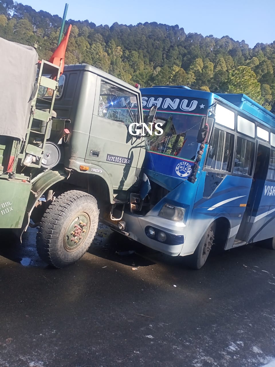 Official sources told GNS that there was collision between army vehicle and the video coach (JK02BH-5393 )at Tota Gali. The injured include Ajaz Ahmed (14) son of Alif Din of Sumbal, Mahmood Ahmed (28 ) son of Mohammad Latif of Gursai, Nazir Hussain (48) son of Lal Din of Marhote , Shafqat Ali son of Mohammad Rashid of Marhote, Arshad Iqbal (23) son of Mohammad Iqbal and Mohd Bashir (70) son of Gulab din of Narain and Bagum Johan (65) wife of Sala Mohammad of Narain.