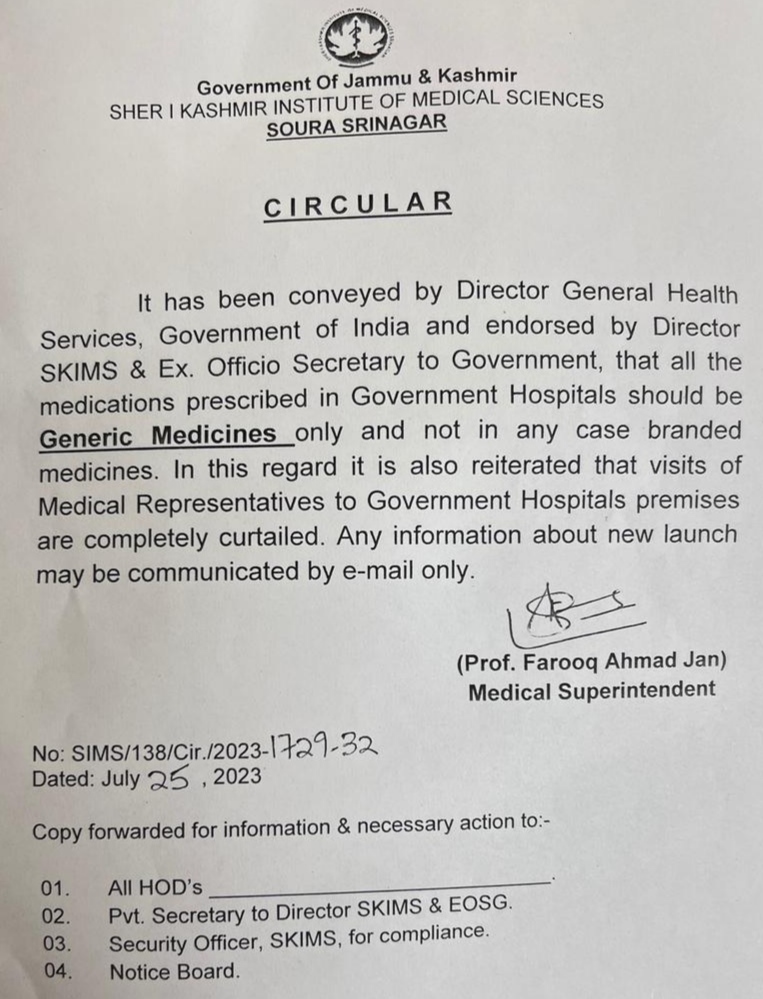 “It has been conveyed by Director General Health Services, Government of India and endorsed by Director SKIMS & Ex. Officio Secretary to Government, that all the medications prescribed in Government Hospitals should be Generic Medicines only and not in any case branded medicines”, reads a circular by Medical Superintendent Prof. Farooq Ahmad Jan, a copy of which lies with SNS KASHMIR.
