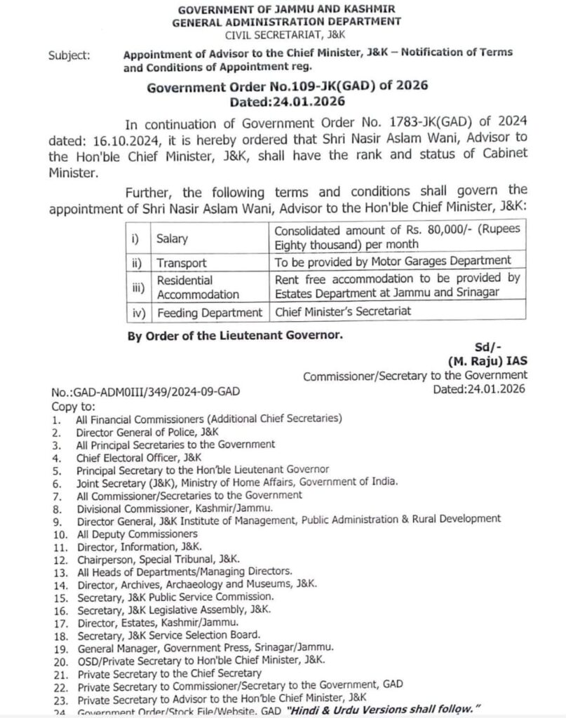 According to an order, a copy of which is in possession of the news agency—Kashmir News Observer (KNO), Nasir Aslam Wani will be entitled to a consolidated amount of Rs 80,000 per month, rent-free accommodation, and transport facilities to be provided by the Motor Garages Department.