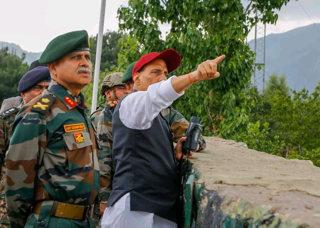 Raksha Mantri Shri Rajnath Singh visited the forward areas of Jammu & Kashmir on June 16, 2022 and took stock of the security situation along the border. Chief of the Army Staff General Manoj Pande; General Officer Commanding-in-Chief (GoC-in-C), Northern Command Lt Gen Upendra Dwivedi; GoC, 15 Corps Lt Gen AS Aujla and GoC, 19 Infantry Division Maj Gen Ajay Chandpuria accompanied the Raksha Mantri and briefed him about the operational preparedness of the Armed Forces.