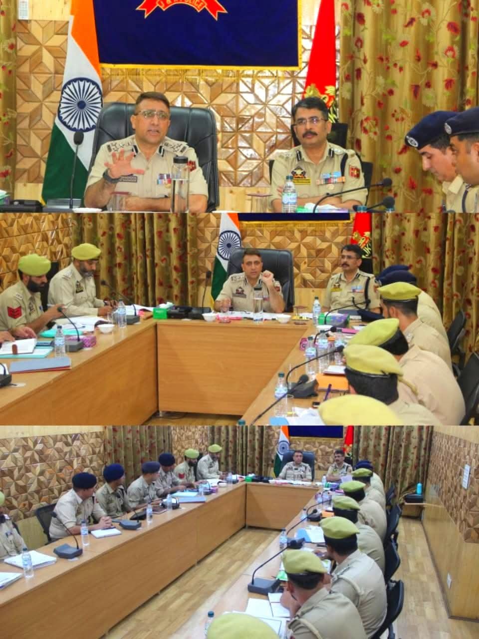 A comprehensive crime and security review meeting was held today at the District Police Office (DPO) Handwara under the chairmanship of DIG North Kashmir Range, Shri. Maqsood-ul-Zaman (IPS). The session was attended by Senior Superintendent of Police (SSP) Handwara Shri Mushtaq Ahmad (JKPS), Additional SP Handwara Shri Fayaz Hussain Shah (JKPS), SDPO Handwara Shri Hamid Hussain (JKPS), Dy.SP PC Handwara Shri Umer Rashid (JKPS), Dy.SP DAR Shri Shafiq Ahmad, along with probationary Dy.SsP, SHOs of all police stations, and DOs of allied PPs.