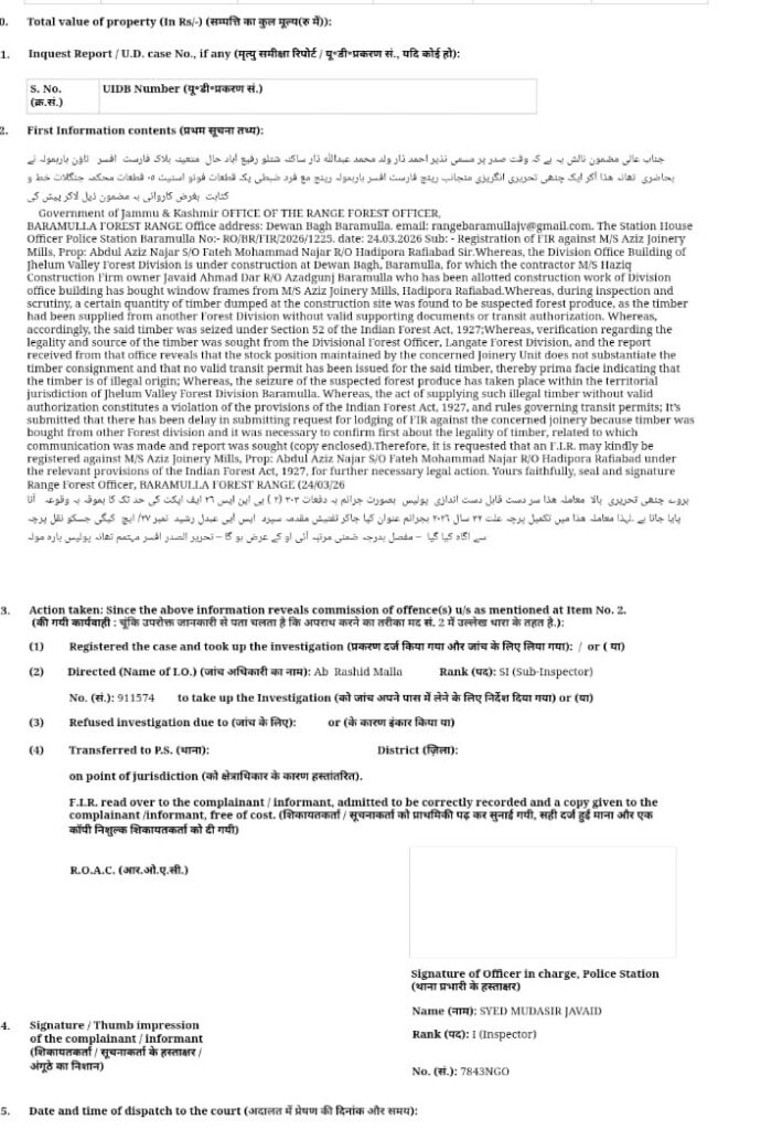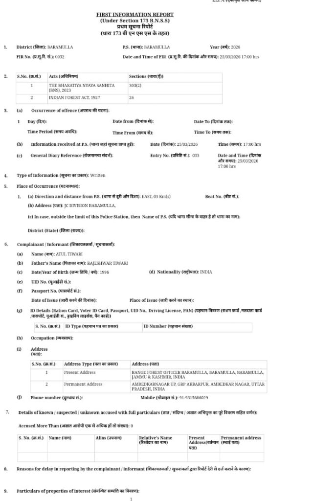 Acting decisively, the DFO Baramulla lodged an FIR at Police Station Baramulla under FIR No. 32, invoking Section 303(2) of the Bharatiya Nyaya Sanhita (BNS) and Section 26 of the Indian Forest Act, 1927. The move is being seen as a significant step towards enforcing accountability in the sector.