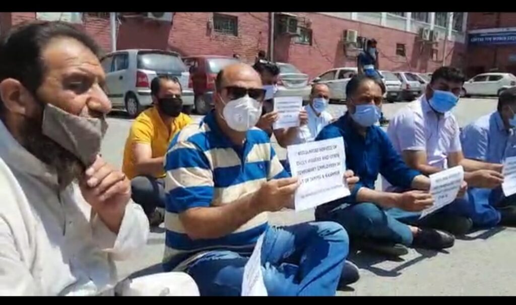 JK Employees Joint Action Committee (EJAC) held a sit in protest in press enclave Srinager today to press for regularisation of 61000 dailywagers working in different departments in UT of Jammu and Kashmir. Led by President EJAC Mohd Rafique Rather scores of EJAC leaders today assembled in pess enclave Srinager with play cards in their hands demanding regularisation of some 61000 daily wagers working in different departments of UT of Jammu and Kashmir and implementation of minimum wages act till their regularisation.