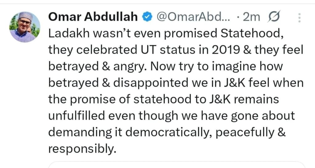 CM Omar as per news agency KNC wrote, “Ladakh wasn’t even promised Statehood, they celebrated UT status in 2019 & they feel betrayed & angry. Now try to imagine how betrayed & disappointed we in J&K feel when the promise of statehood to J&K remains unfulfilled even though we have gone about demanding it democratically, peacefully & responsibly.” (KNC)