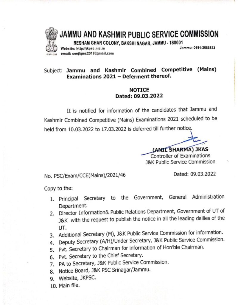 The Notice witch was issued hear today late evening ofter full Commission meeting reads that the controller of examination for JKPSC Anil Sharma has informed its candidates that Jammu and Kashmir Combined Competitive (Mains) Examinations 2021 scheduled to be held from March-10-2022 to March-17 have been deferred till further notice.