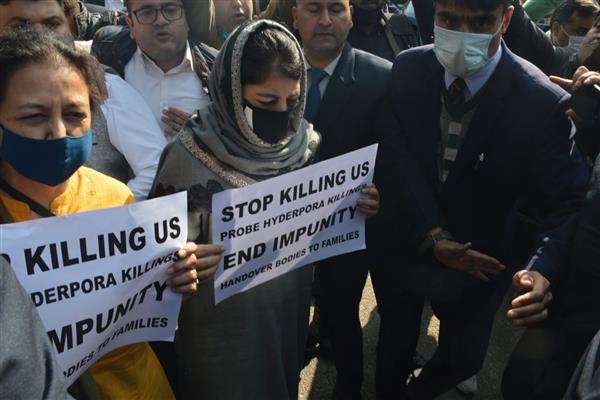 The Jammu and Kashmir People’s Democratic Party led by Mehbooba Mufti on Wednesday staged a protest at Jammu against the civilian killings in Hyderpora encounter on Monday evening.