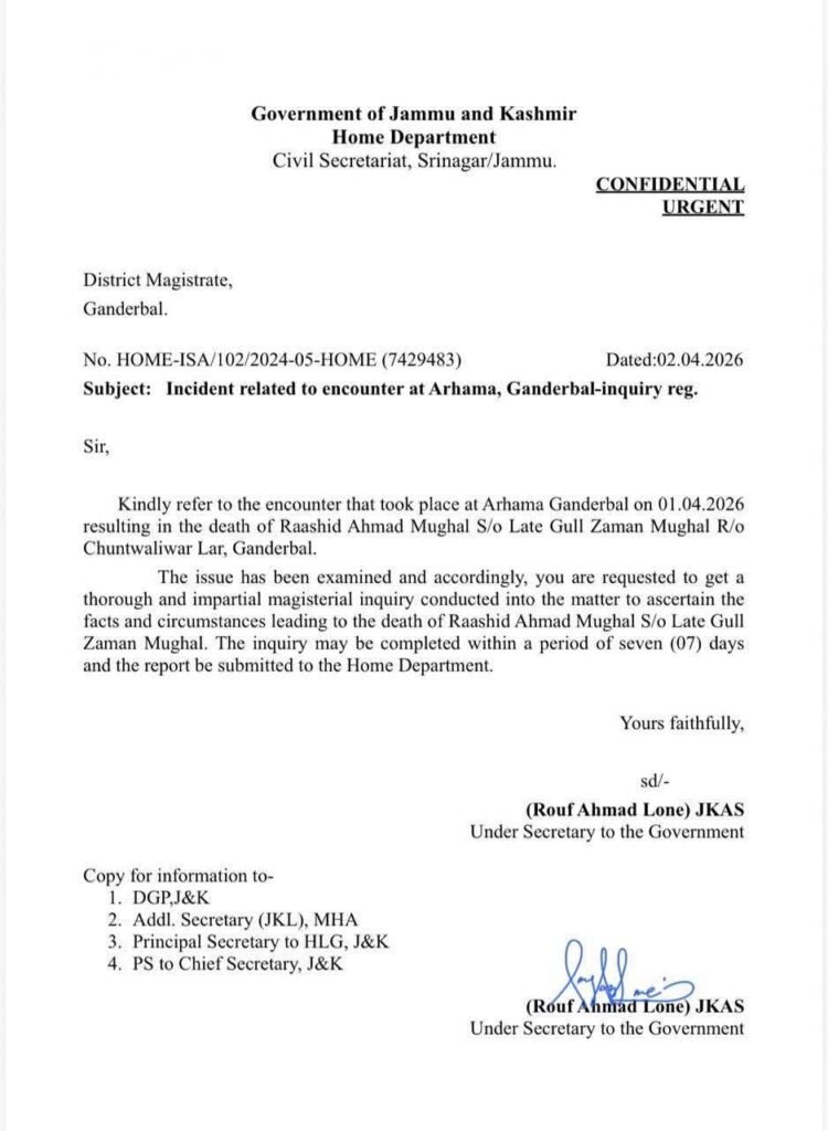 Meanwhile, in a communication to the District Magistrate Ganderbal the Under Secretary to the government the issue has been examined and accordingly, you are requested to get a thorough and impartial magisterial inquiry.