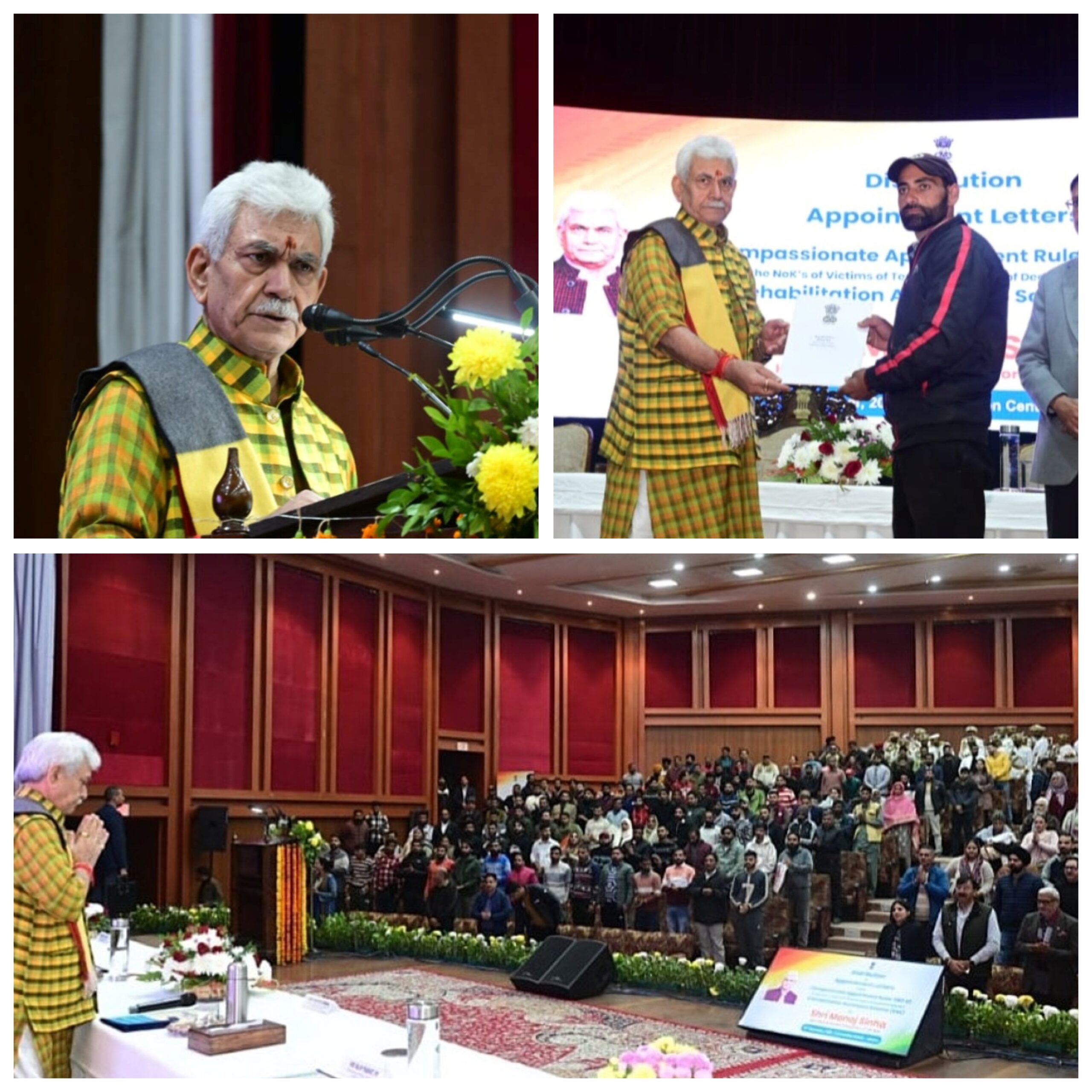 In a significant step toward delivering long-denied justice, Lieutenant Governor Manoj Sinha on Thursday handed over government appointment letters to 41 Next of Kin (NoKs) of terror victims from the Jammu division, reaffirming the administration’s commitment to restoring dignity, security, and recognition to the families who have suffered at the hands of terrorism for decades.