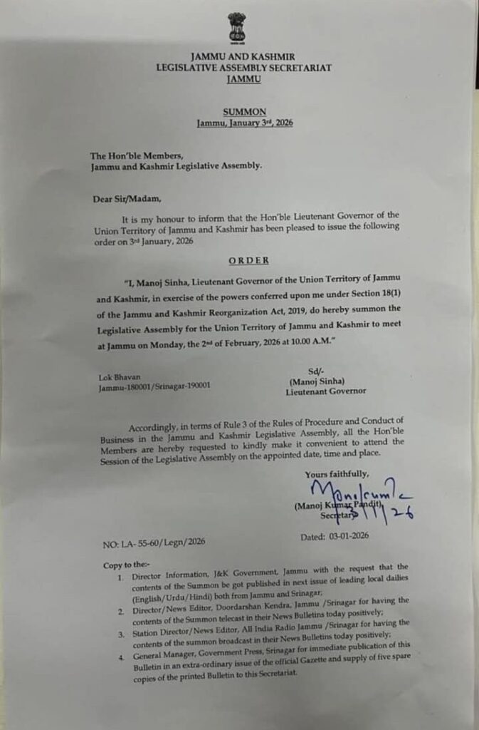 “I, Manoj Sinha, Lieutenant Governor of the Union Territory of Jammu and Kashmir, in exercise of the powers conferred upon me under Section 18 (1) of the Jammu and Kashmir Reorganisation Act, 2019, do hereby summon the Legislative Assembly for the Union Territory of Jammu and Kashmir to meet at Jammu on Monday, the 2nd of February, 2026 at 10:00 A.M.,” reads the summon, a copy of which is with news agency—Kashmir News Observer (KNO)