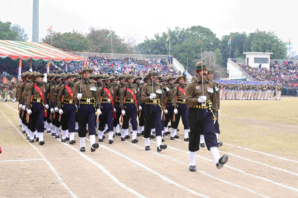 The march-past featured a disciplined display by smart contingents from Army, BSF, CRPF, SSB, IRP (Women & Male), J&K Police, JKAP, UT Disaster Response Force, J&K Fire and Emergency Services, J&K Forest Protection Force, Excise & Taxation Department, Ex-Servicemen, NCC (Boys and Girls), Bharat Scouts and Guides (Girls & Boys) and several school contingents, Brass & Pipe Bands of Army, BSF, J&K Police and Band Troops (Girl & Boys) of different Schools.