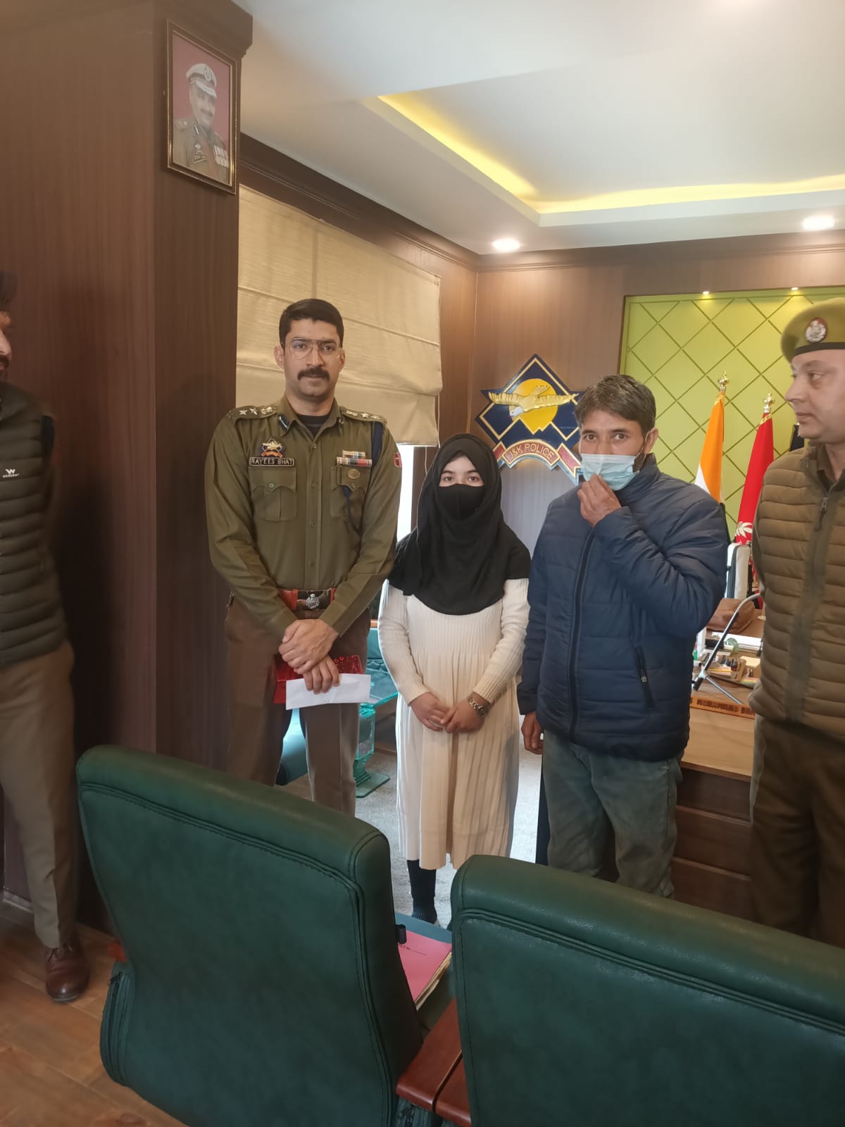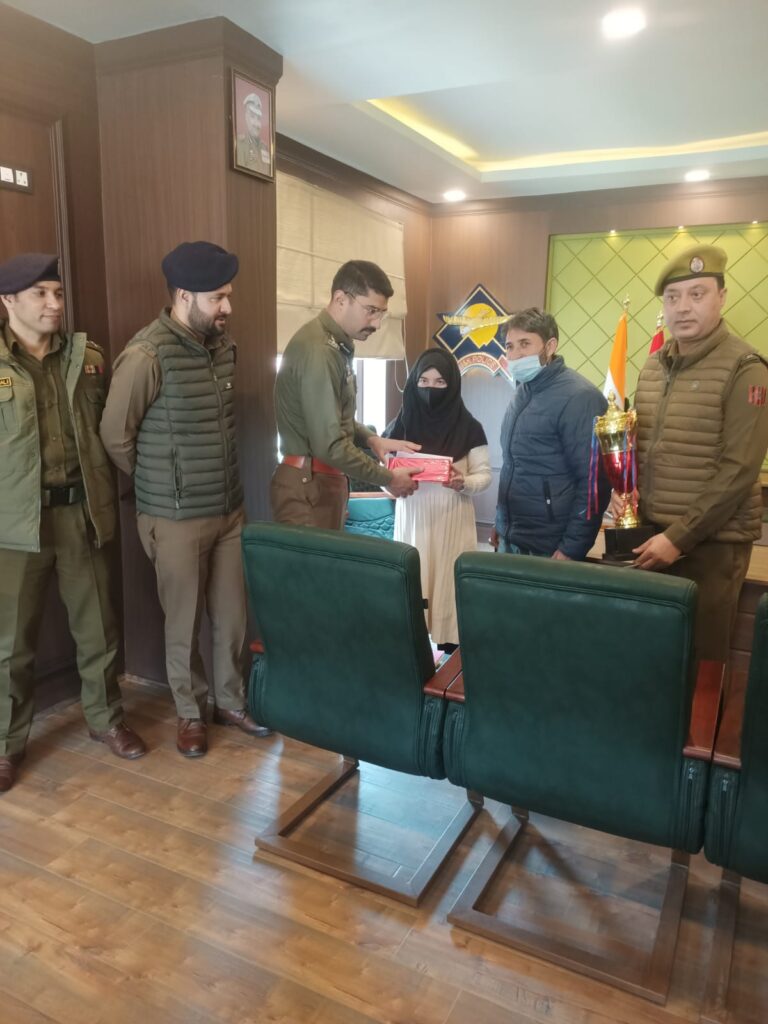 Today, SSP Baramulla Shri Rayees Bhat along with SDPO Pattan Sh Nawaz Khanday & IC PP Palhalan SI Athar Parvez felicitated recent 10th topper from Palhalan namely Tabeena Fayaz who secured 100% (500/500) at Baramulla.