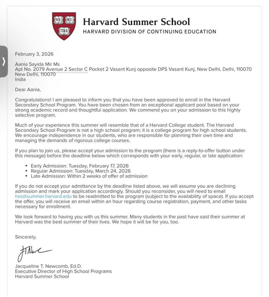 In a moment of immense pride and celebration for the Tangmarg area, Aania Sayida Mir of Hariwatnoo Tangmarg has been selected for the prestigious Harvard Summer School at Harvard University.