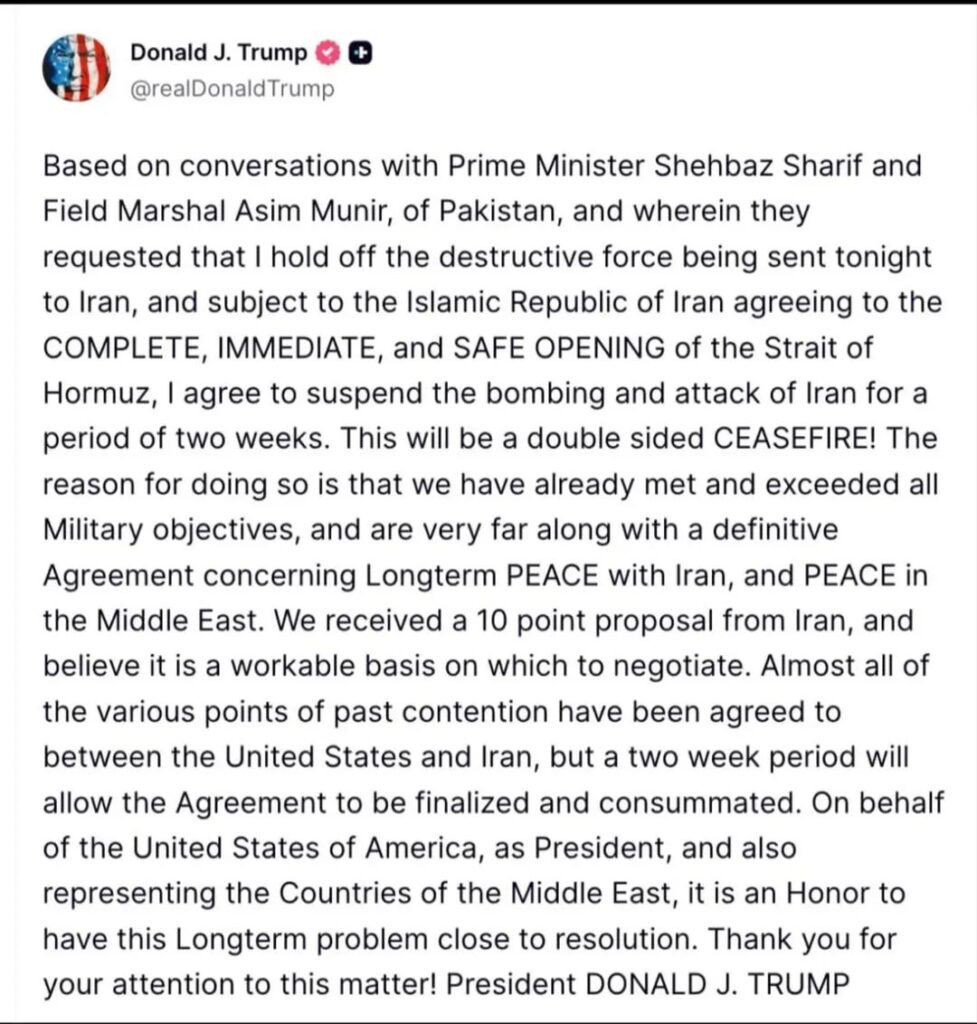 “I agree to suspend the bombing and attack of Iran for a period of two weeks,” Trump said, adding that this will be a double-sided ceasefire.